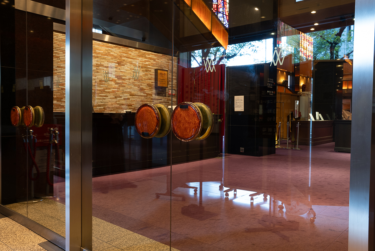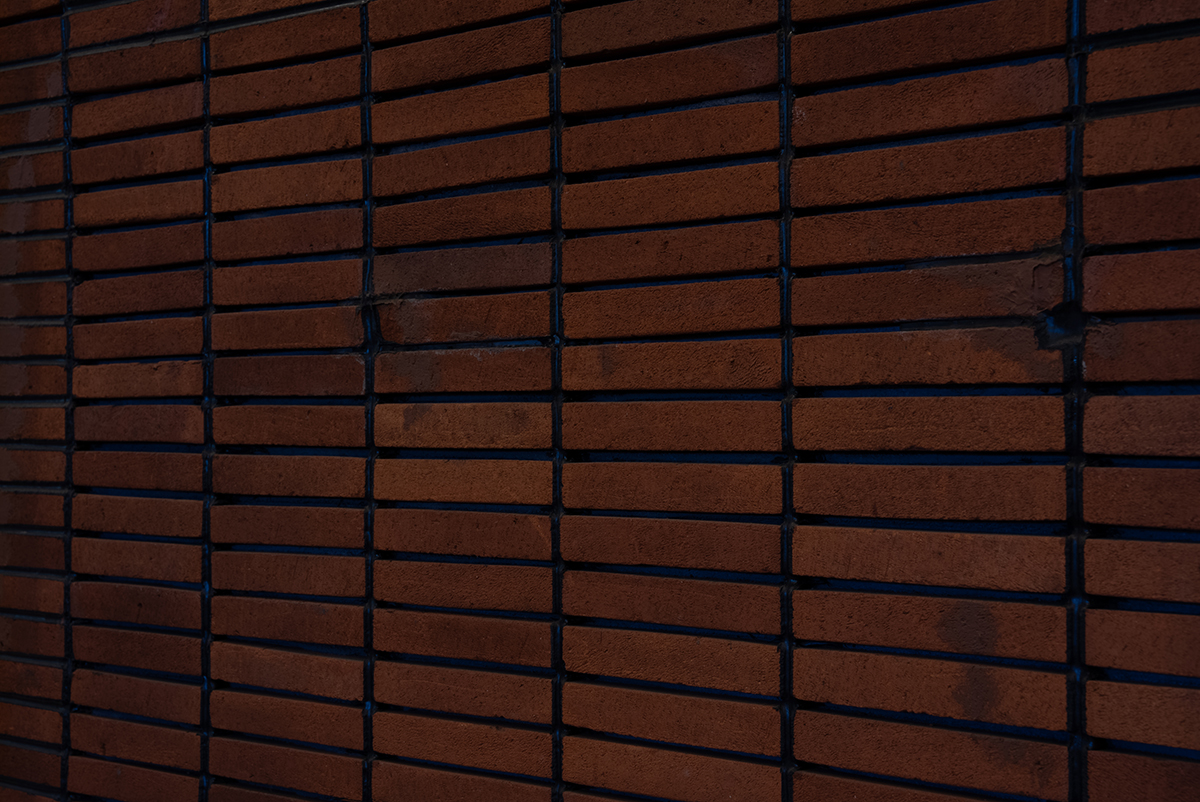 - ロビー壁の煉瓦と入口のガラス扉