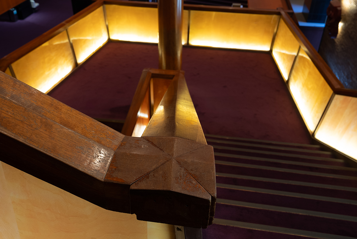 - 階段の手摺りを支えていた木目が印象的な突板アクリル板は優雅で気品ある照明とBOXに生まれ変わりました。