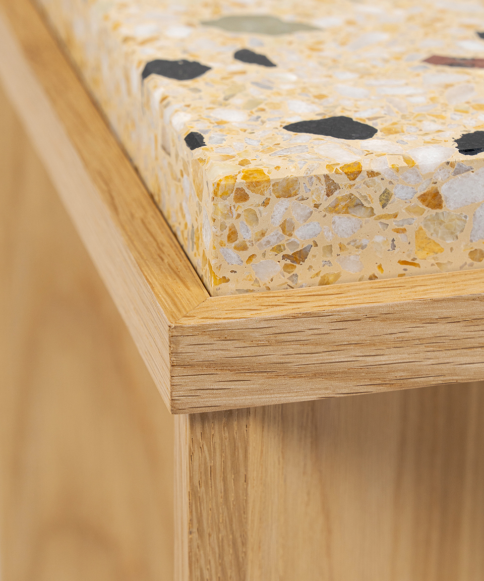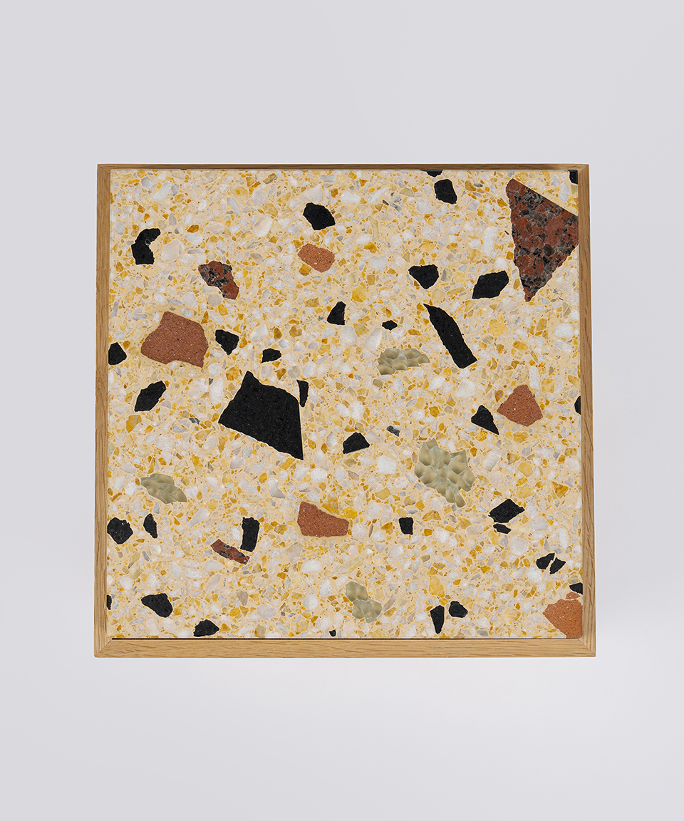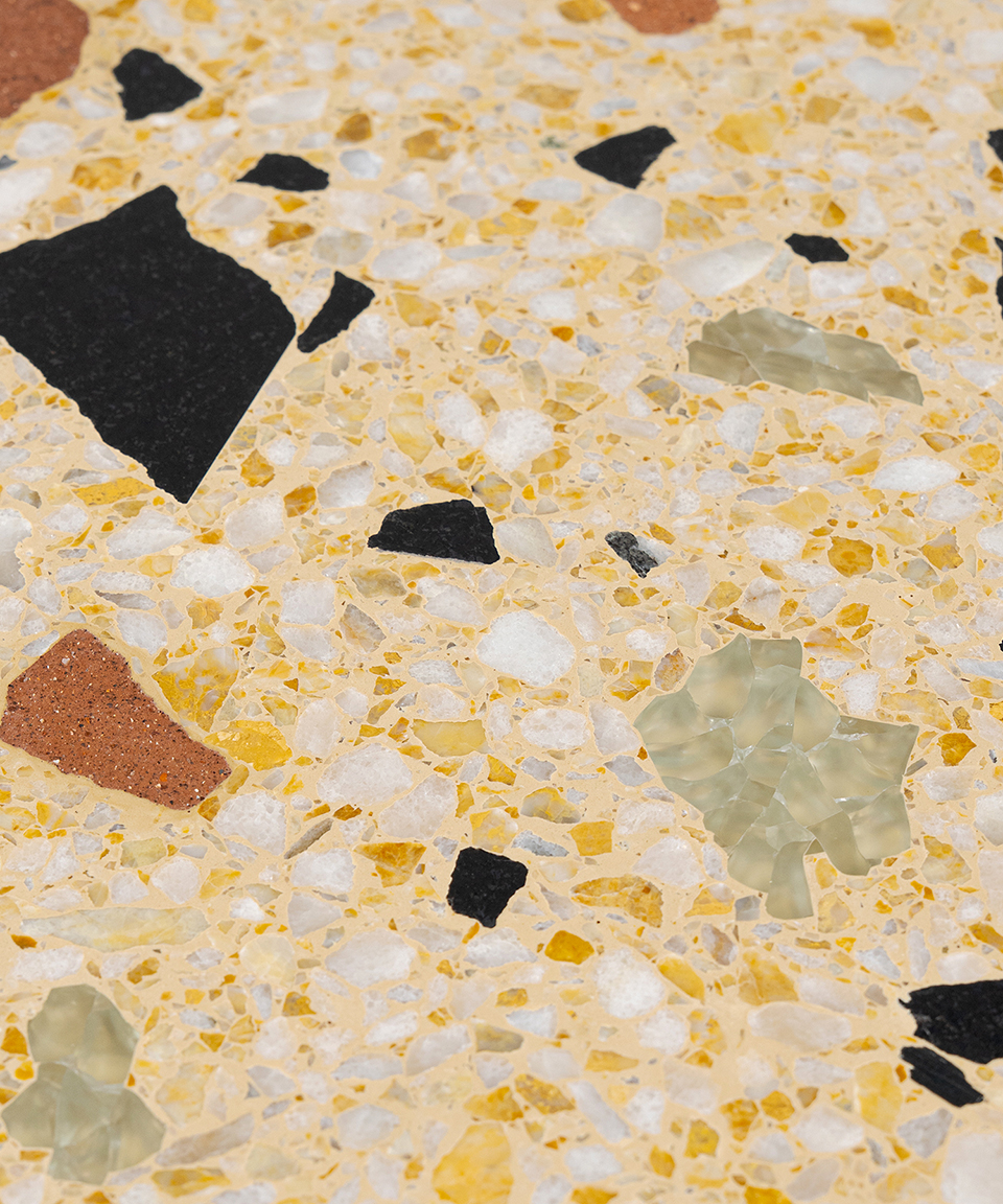 劇場を支えてきた石とレンガとガラスを細かく砕き再構成することで、1点ごとに異なる模様を持つ新たな素材へと生まれ変わりました。長い年月をかけて劇場の風景の一部であった素材たちに、新たな役割と居場所を与えることで、帝国劇場の記憶がこれからも日常の風景の中で静かに息づくことを願っています。