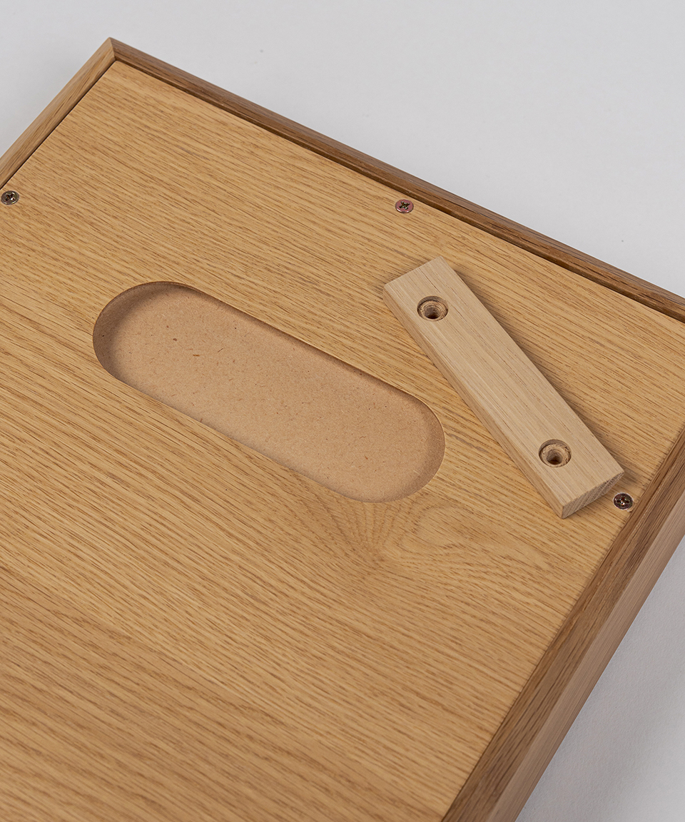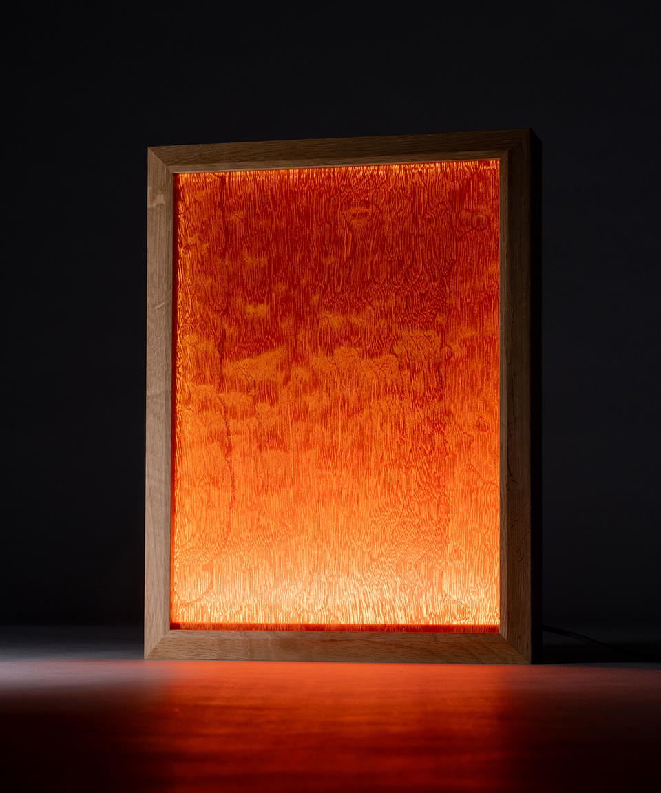 帝国劇場ロビー階段の手摺りに使用されていた突板アクリル材をアップサイクルし、新たな照明として再生させたデザインです。突板をアクリルに封じ込める技法は当時として大胆かつ革新的で、その素材は劇場空間の中で光を纏い、来場者の足元を照らしてきました。