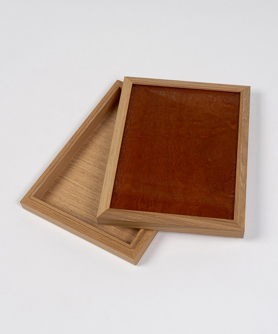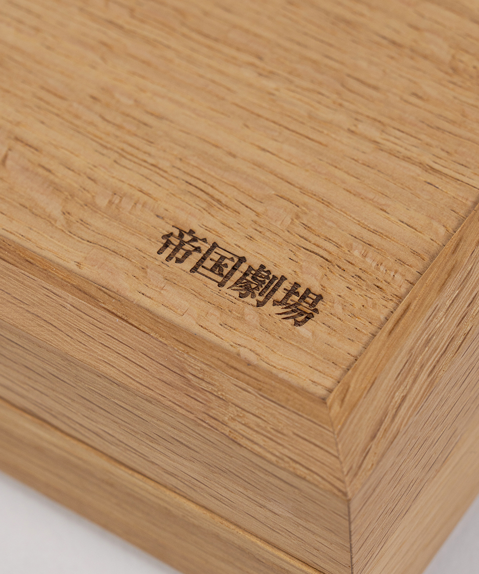 帝国劇場ロビー階段の手摺りに使用されていた突板アクリル材をアップサイクルし、新たな収納箱として再生させたデザインです。突板をアクリルで挟み込む技法は当時としても先鋭的で、その開発の背景には多くの挑戦があったと想像されます。