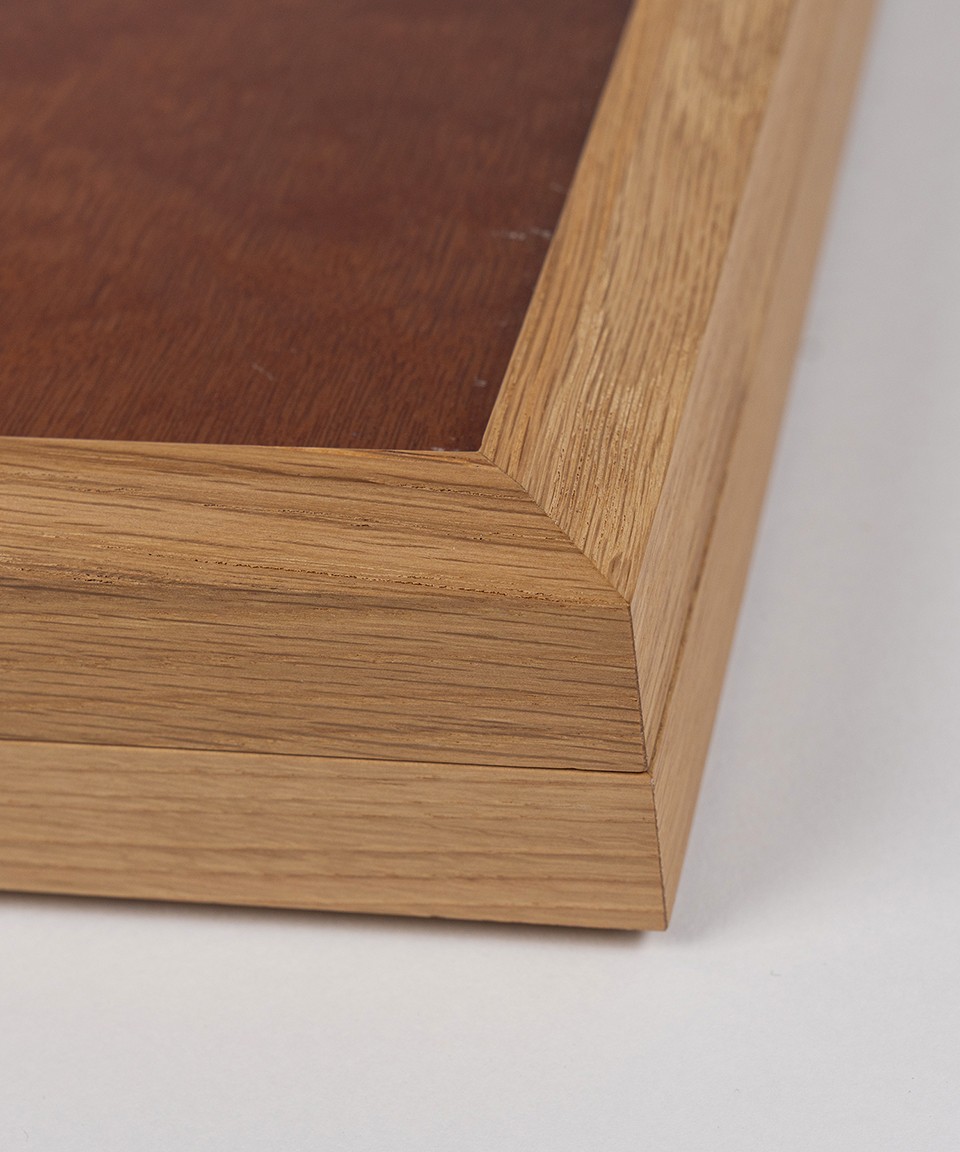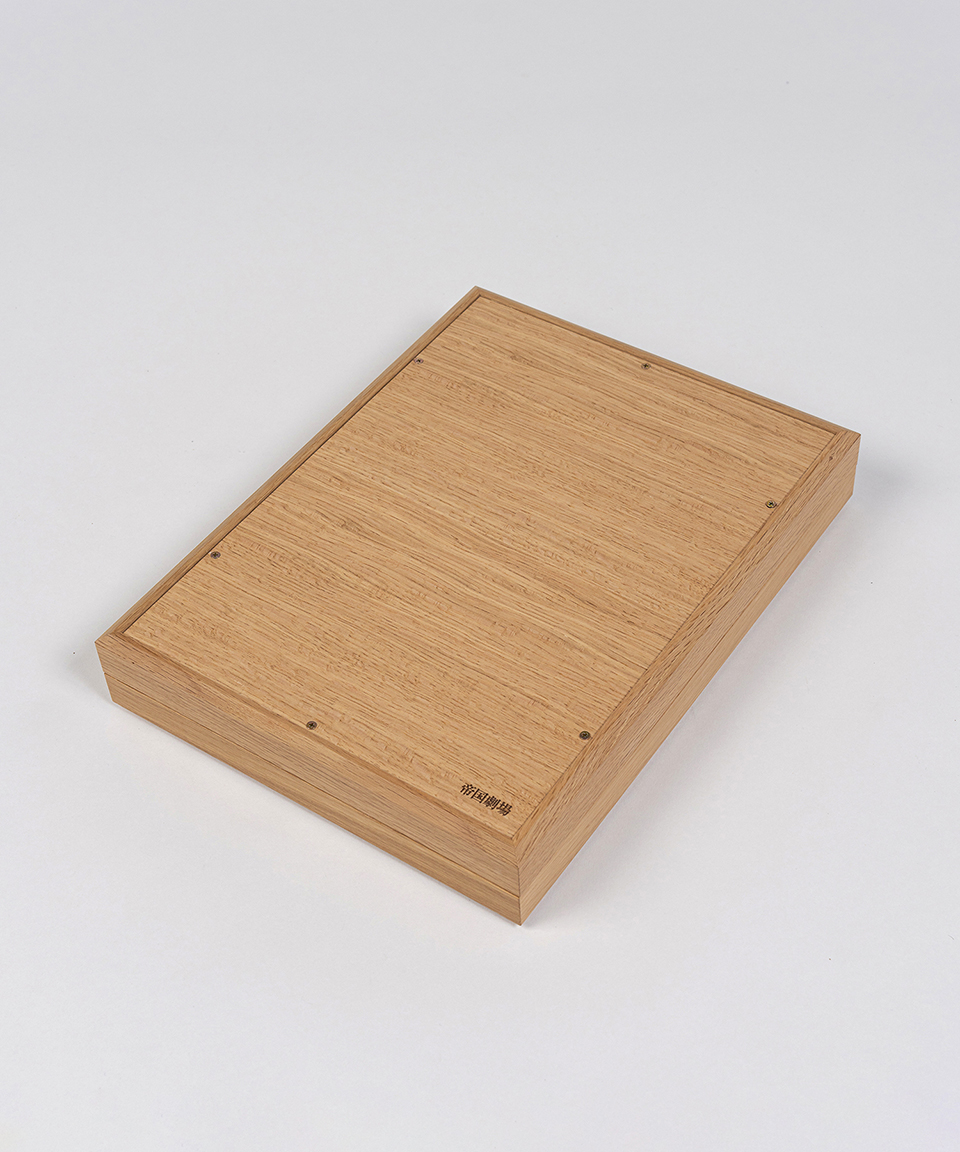 この“技術のレガシー”を未来へと引き継ぐため、木部のフォルムには手摺りの特徴的なディテールを引用し、カリモクの木工技術によって当時の意匠の余韻を現代に再解釈しました。内部寸法は公演A4チラシが収まるサイズに設計。