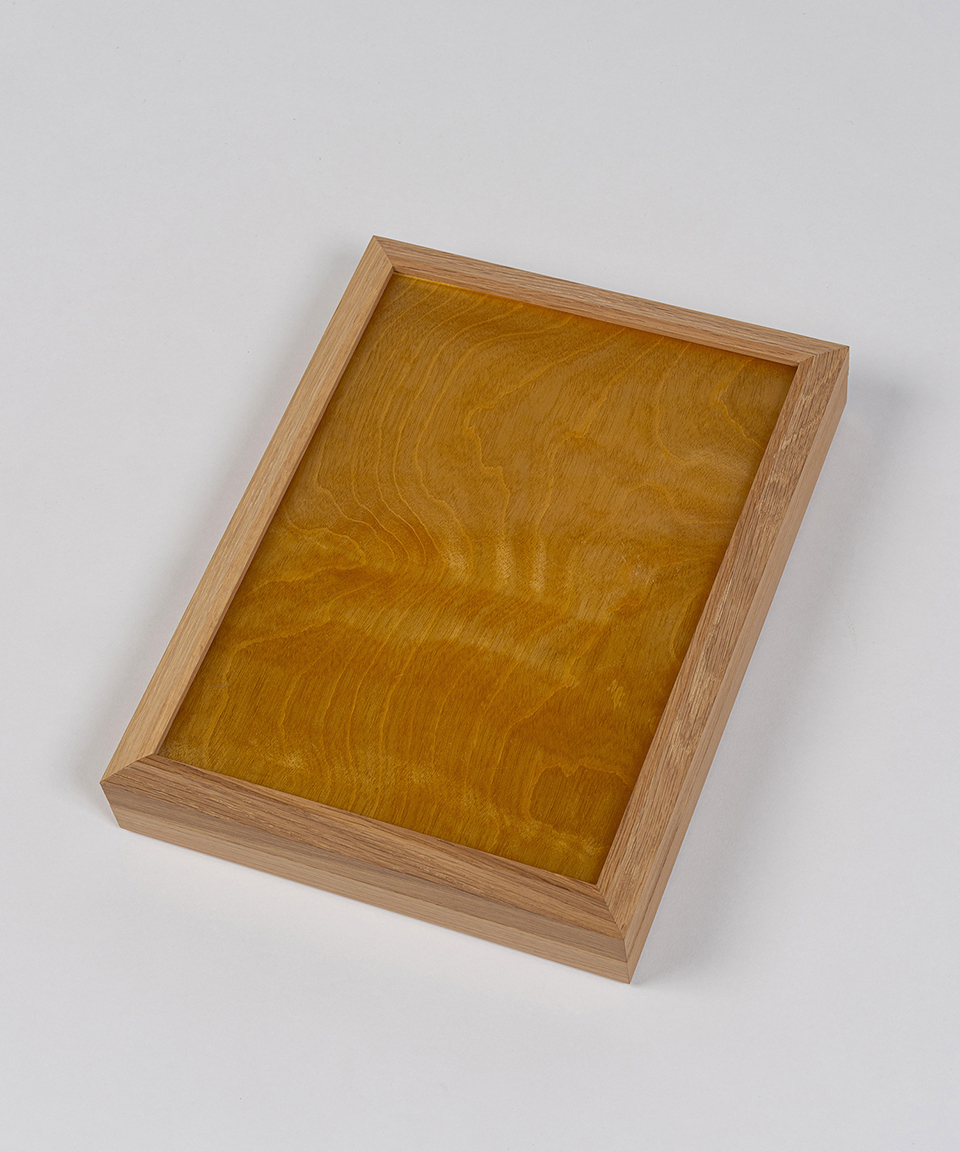 帝国劇場ロビー階段の手摺りに使用されていた突板アクリル材をアップサイクルし、新たな収納箱として再生させたデザインです。突板をアクリルで挟み込む技法は当時としても先鋭的で、その開発の背景には多くの挑戦があったと想像されます。