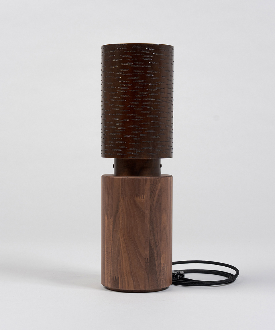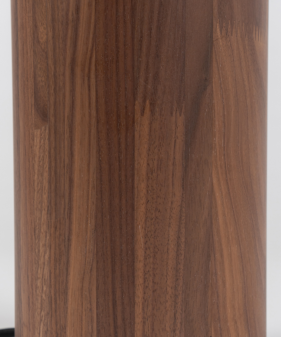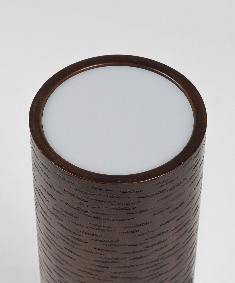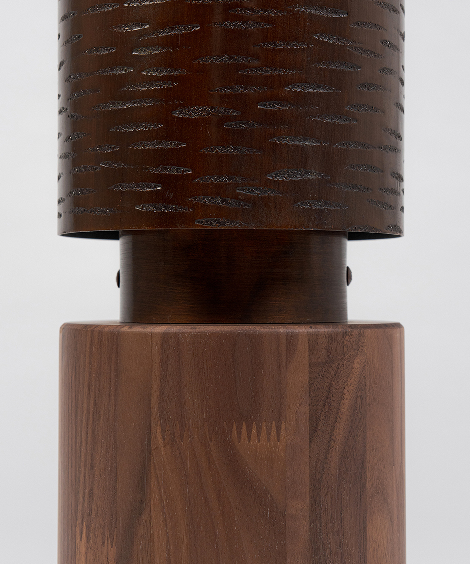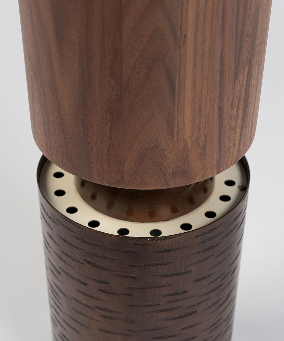 主に1・2階ロビー上手下手の通路で使用され、約59年間お客様の足下を照らしてきた筒型の照明が、アッパーライトとして生まれ変わりました。本Mサイズは、土台部分に照明本体と同系色のウォールナット材を採用し、 高さを出すことでインテリアとしても空間が映えるデザインになりました。