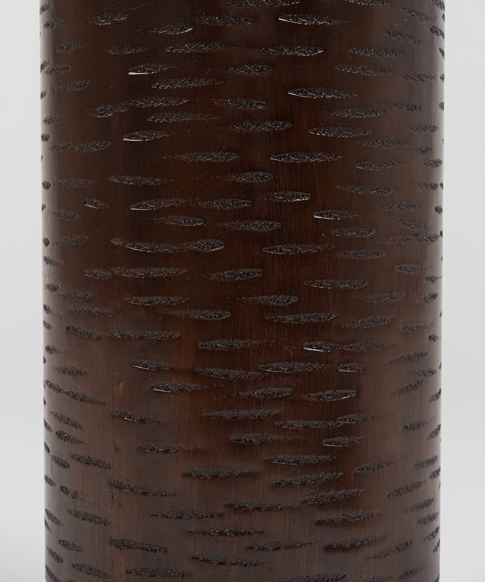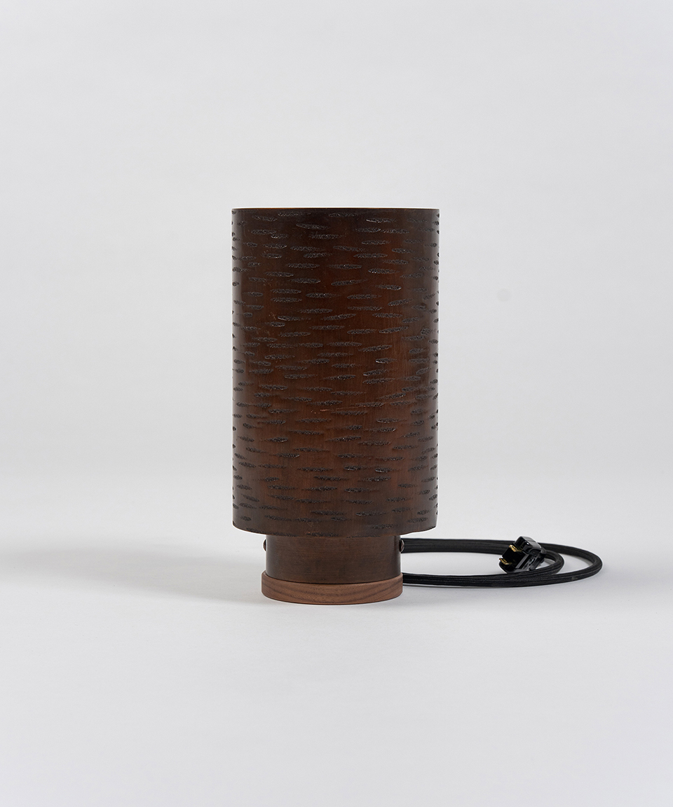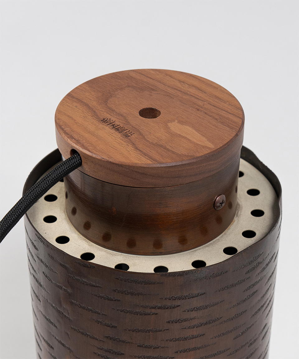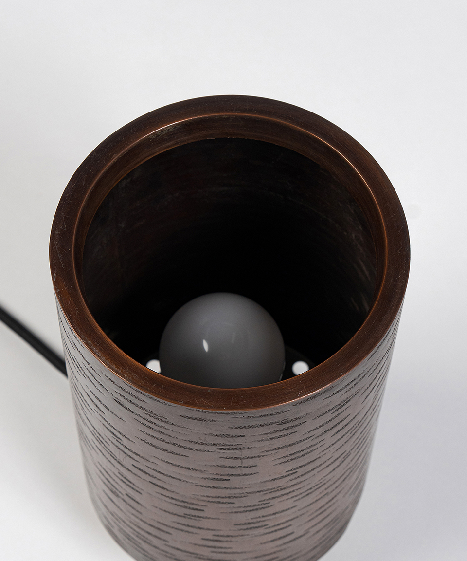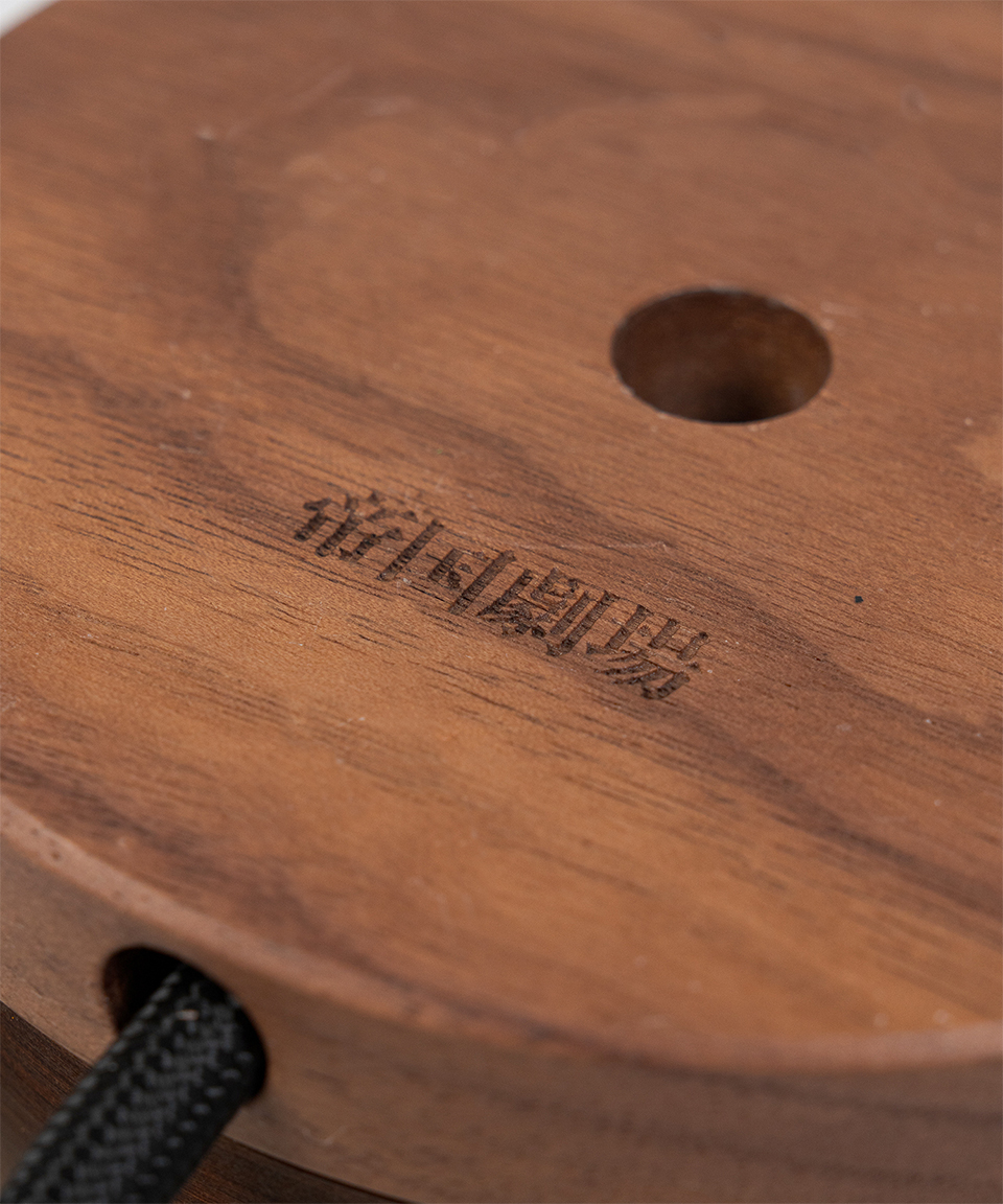 主に1・2階ロビー上手下手の通路で使用され、約59年間お客様の足下を照らしてきた筒型の照明が、アッパーライトとして生まれ変わりました。本Sサイズは、帝劇ロビーで存在していた形状を残しつつ、 配線コードを挿入する土台部分を、カリモク家具のウォールナット材でささやかなアクセントとしてリメイク。