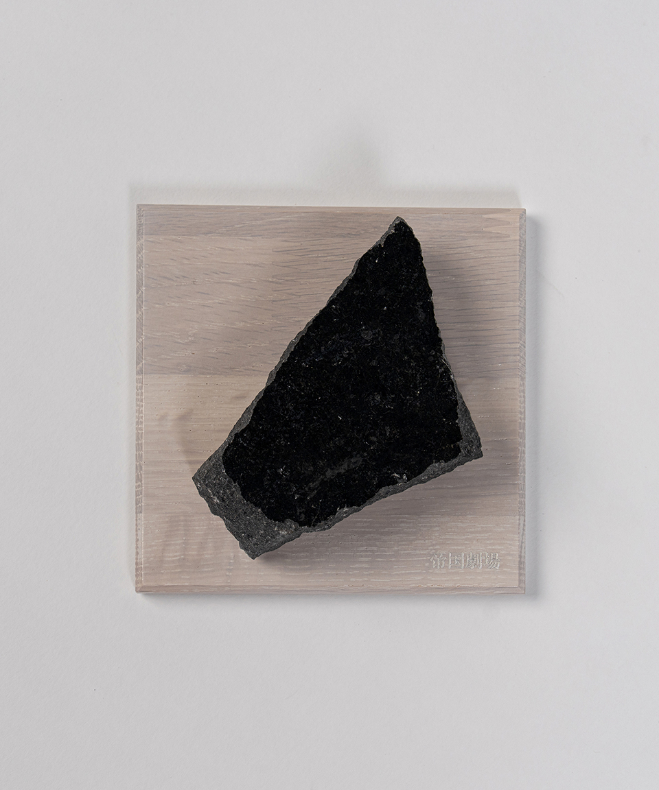 1966年の開場時から帝劇を見つめてきたロビー柱の自然石ブラックスェードの欠片を、帝劇外観に見立てたオブジェ。木の台座と共にお届けいたします。