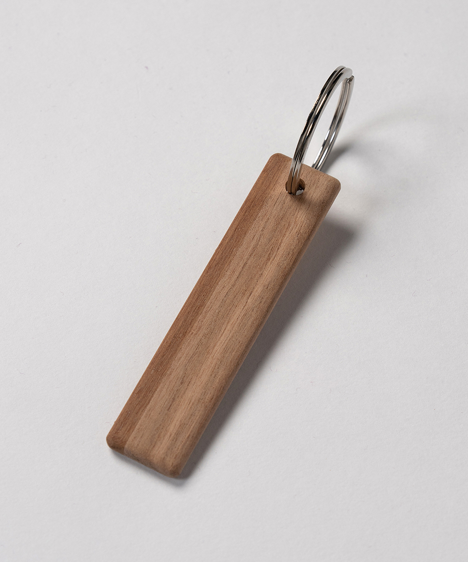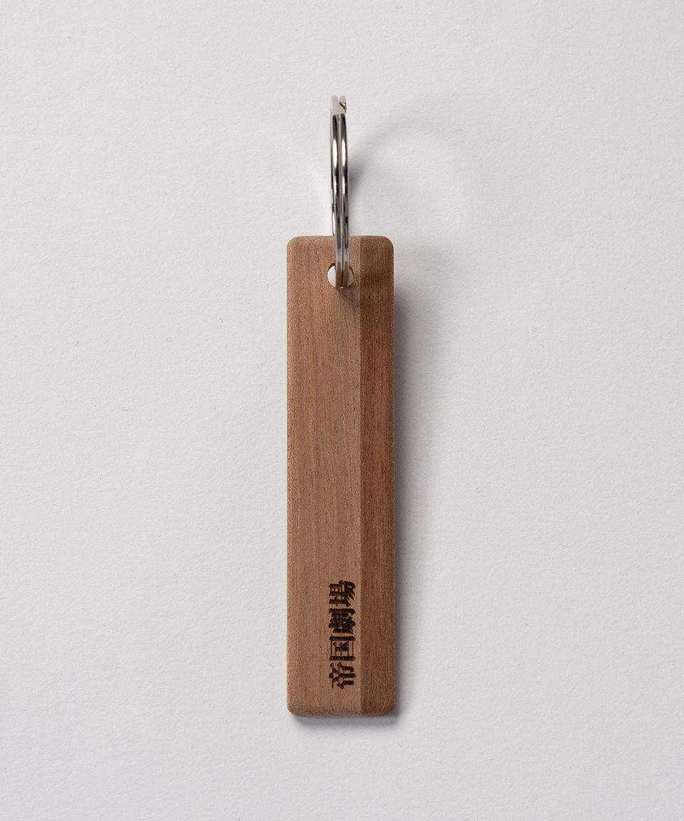 本アイテムは、そんな着到板をキーホルダーとして、ロビー手摺りの木を削って制作しました。まさに帝国劇場の命が宿った着到板です。