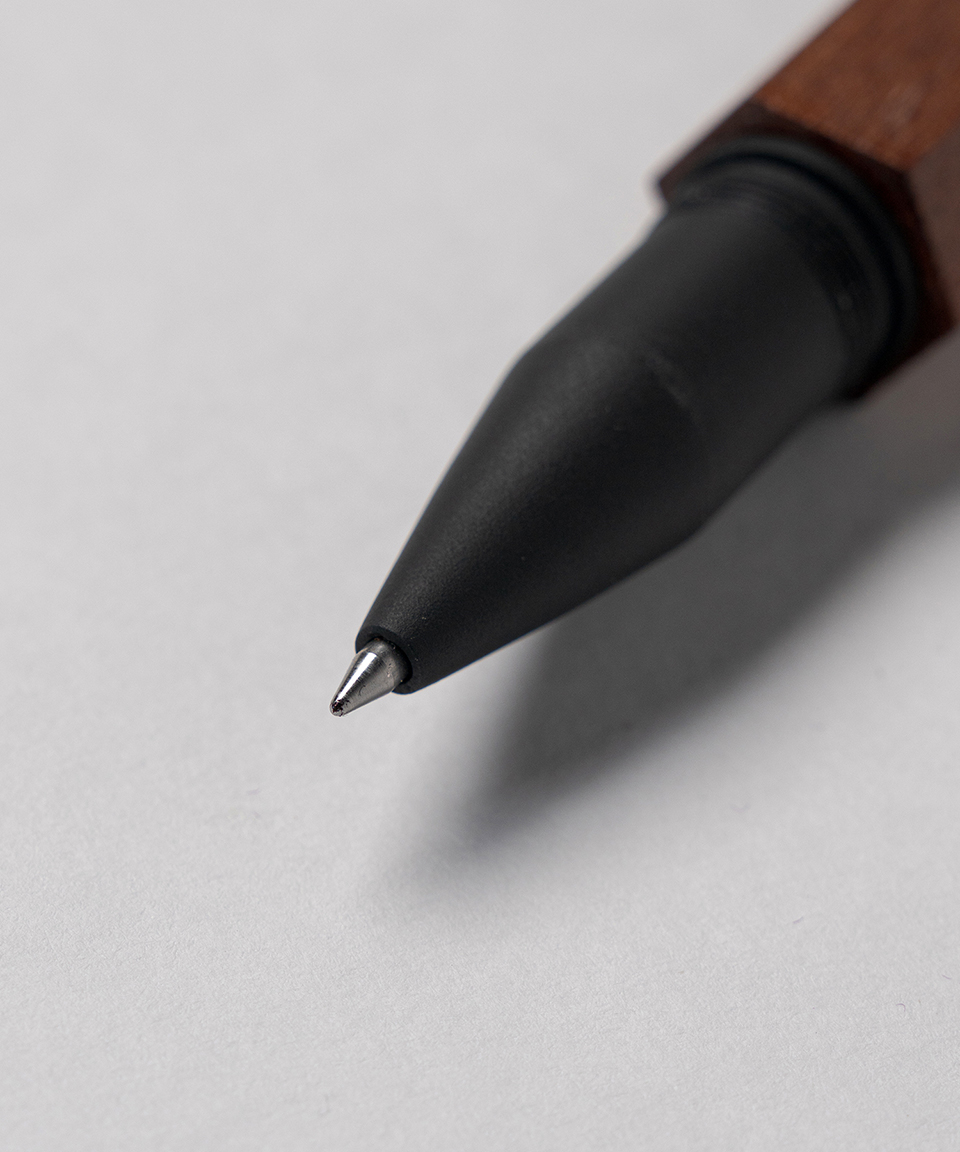 削り出した六角軸の木材とアクリルを組み合わせたボールペンは、重厚感のある作りが特徴です。
