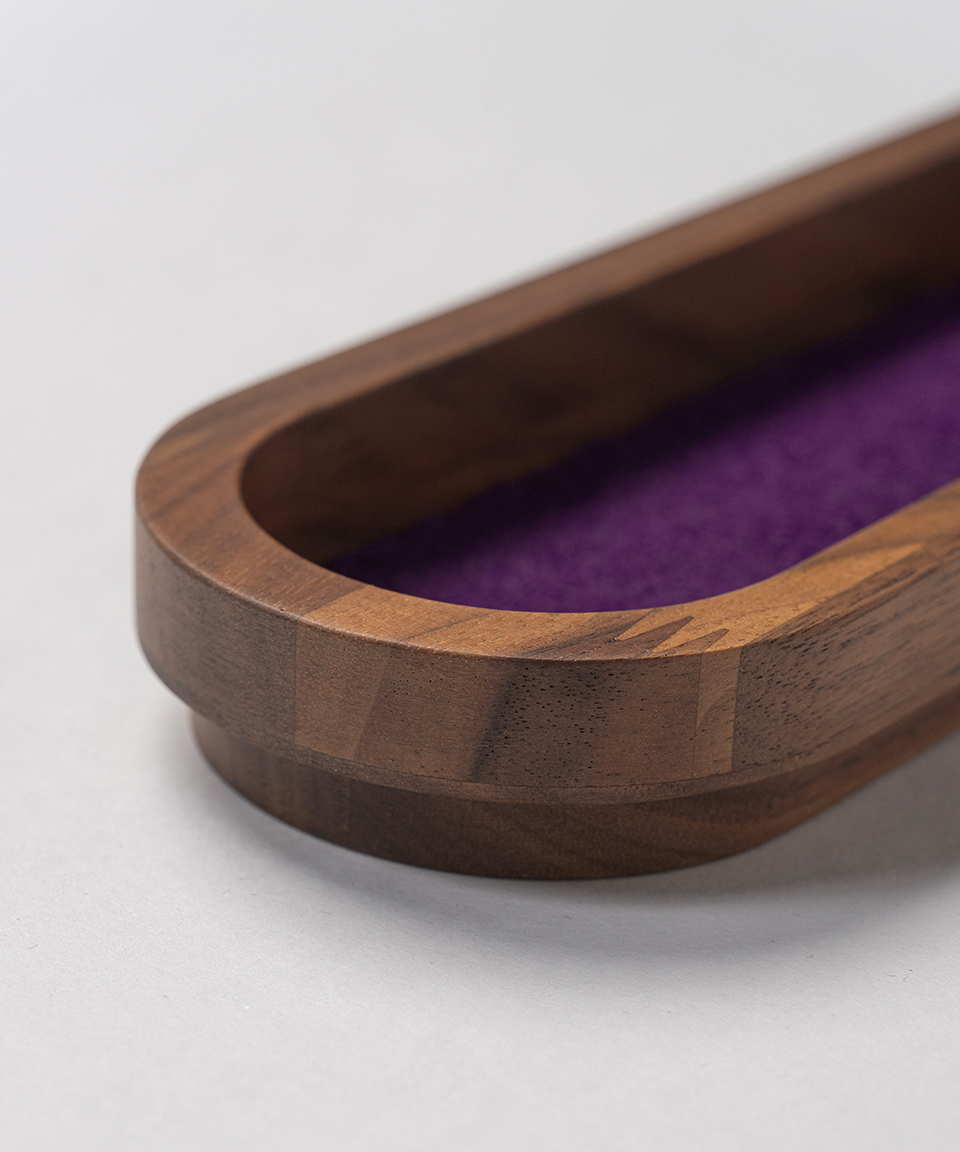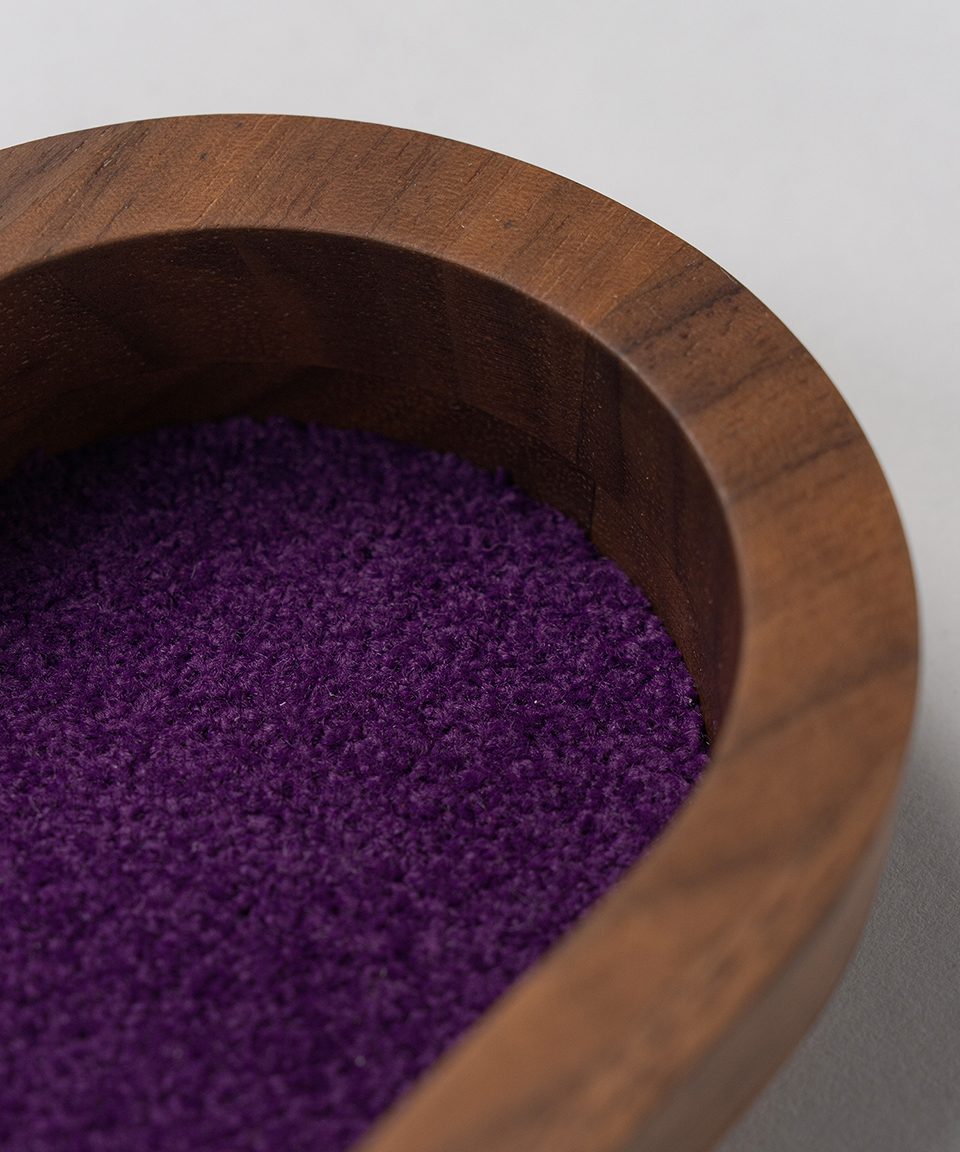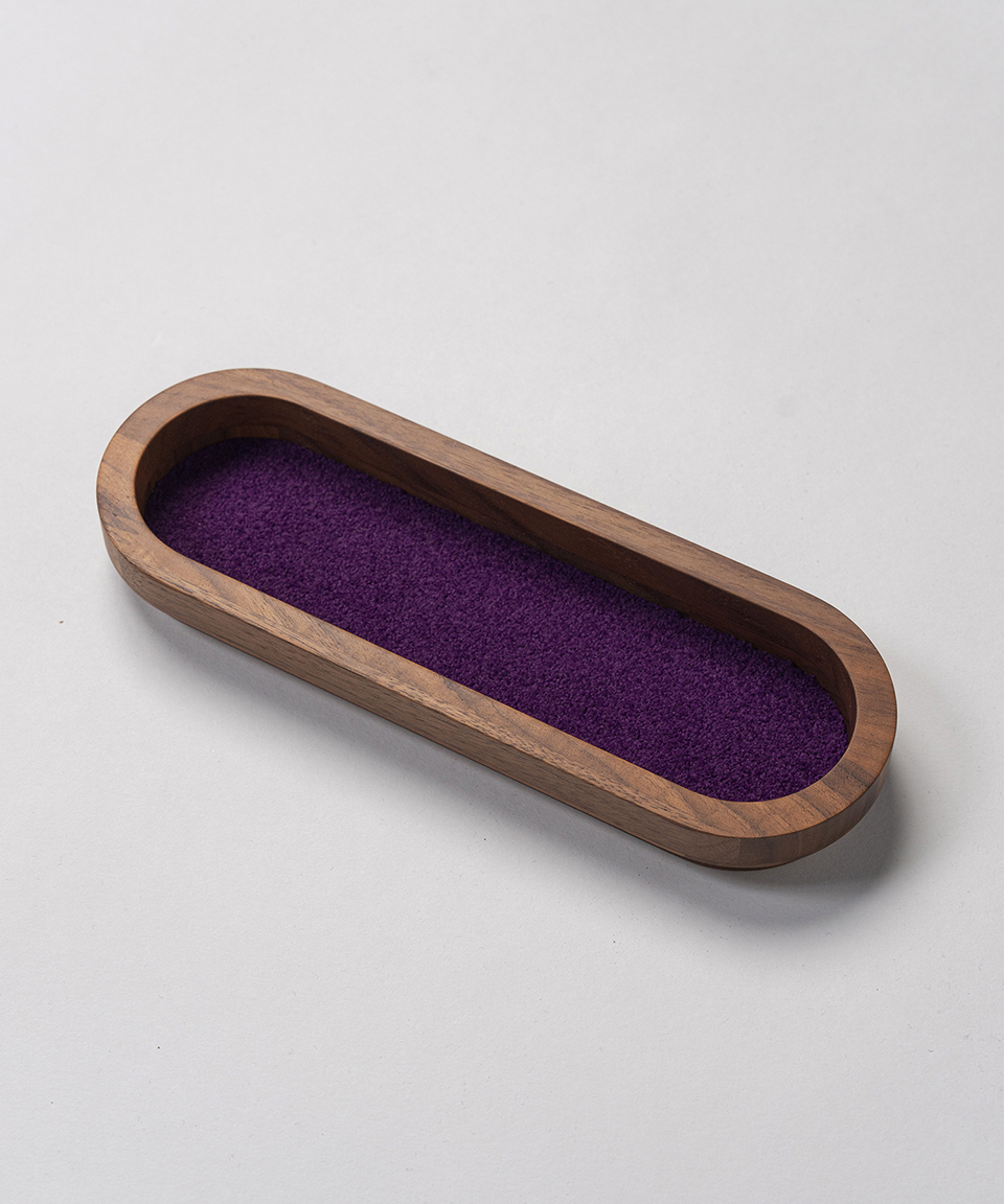 帝国劇場の客席で長く愛されてきた象徴的な古代紫色のモケット生地と、上質なウォールナット材を組み合わせたシンプルなオーバル型のワイドトレイ。